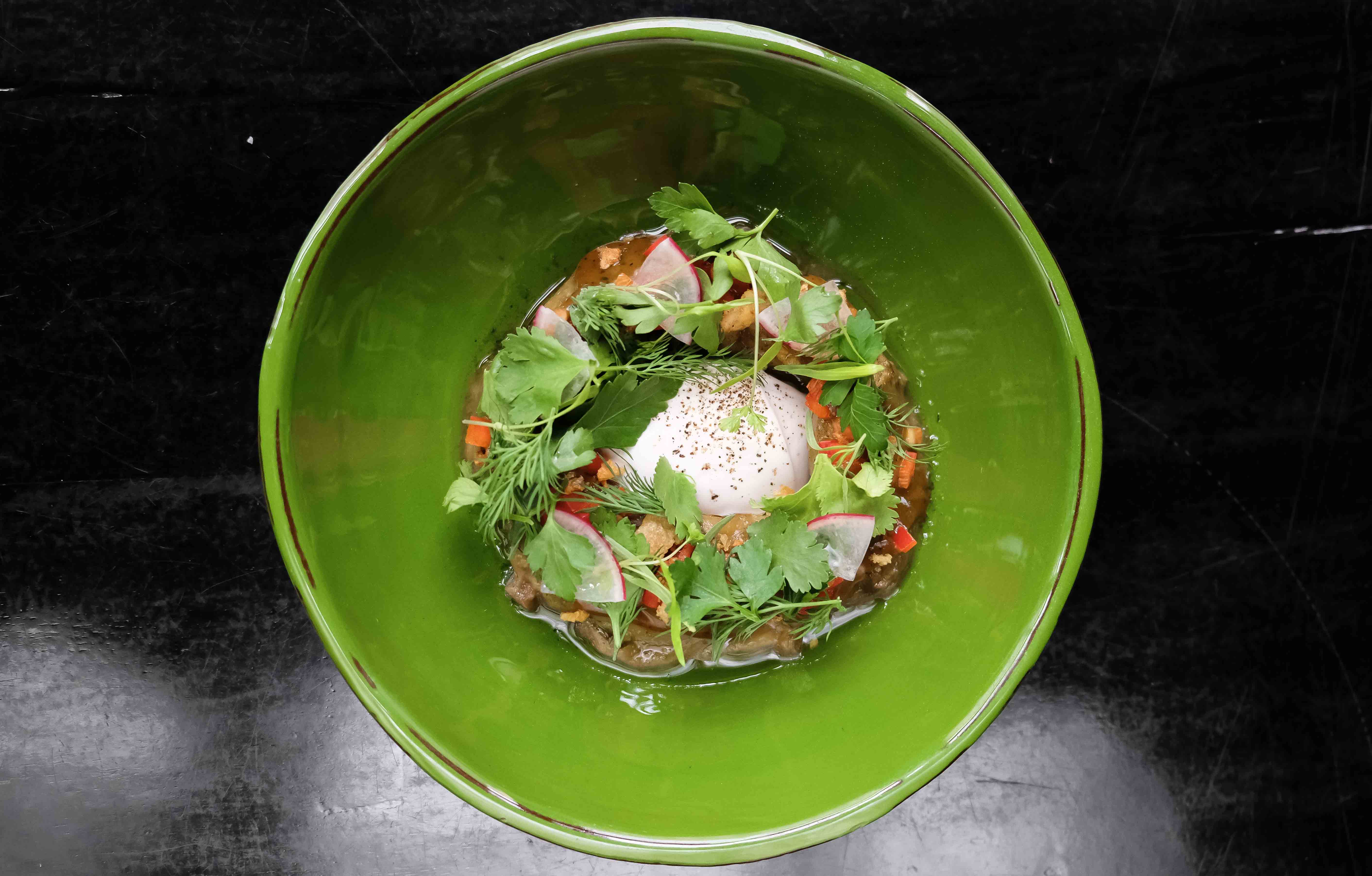 Бренд-шеф Дан Мирон и шеф-повар Анатолий Левизов предлагают гостям щи на овощном бульоне с савойской капустой и перцем «рамиро», а также печеный баклажан с муссом из белой фасоли. Обязательно попробуйте десерт — грушу конфи с кориандром и анисом на тесте фило с кокосовым сорбетом.