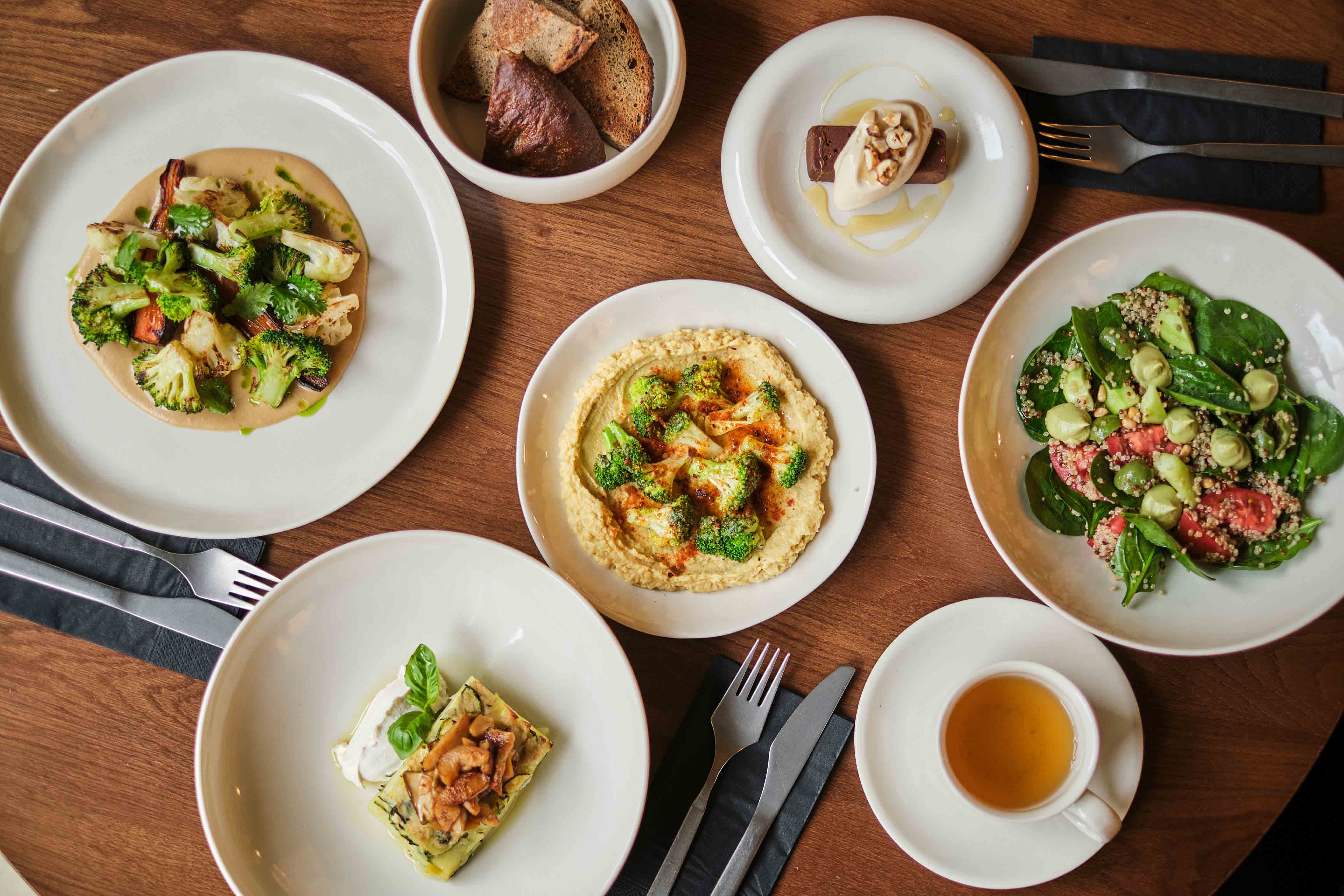 В бистро Blau фокус на гастрономических традициях Востока. В меню — овощной салат со сладкими помидорами, авокадо, киноа и перцем чили, а также стейк из цветной капусты с миндалем и соусом чимичурри. А для более плотного приема пищи стоит обратить внимание на донер с фалафелем и овсяным йогуртом.