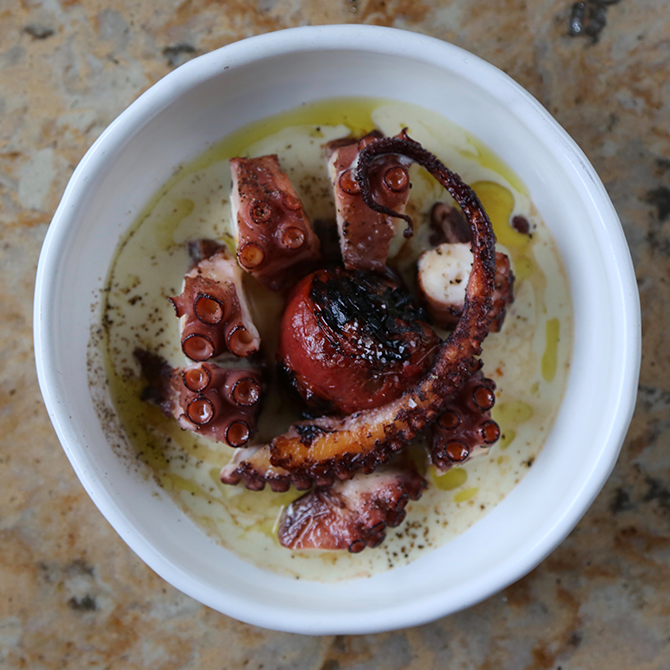 Ресторан момента, talk of the city, место, куда надо бы пойти прямо сейчас, но, к сожалению, получится не у многих. Резерв за две недели минимум (это еще Michelin к нам не пришел), но здесь уже с первого дня все-все-все. Меню суперлаконичное (как и дизайн заведения), но проходных позиций нет. Из греческого — салат за 790 рублей, но он огромный — берите смело на двоих. Вариации на тему мезе — тут уже на ваш выбор, либо артишоки с тунцом за 330 рублей, либо тунец с трюфельной заправкой за 880 рублей. Обязательно оставьте место для горячего — на гриле тут готовится сибас (920 рублей), но нежнейший лосось ничем не хуже (950 рублей).