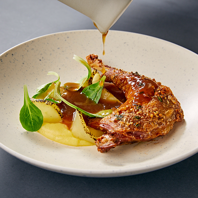 Шеф-повар Илья Кокотовский (питерские Gras и Molto Buono, московские «Цирк», «Иностранцы») изучает старинные рецепты и подает на новый лад: российский гусарский «мясной чай» (по сути, наваристый мясной бульон), который идет в бутылке из-под шампанского, французская ножка петуха конфи с печеными яблоками и картофельным пюре (890 рублей), каша из спельты с опятами (490 рублей). Винная карта с акцентом на вина из нетрадиционных регионов из 50 позиций, разделенных по сортам.