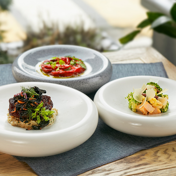 Тарас Кириенко приготовил сет из трех позиций, каждая из которых состоит из двух основных ингредиентов: страчателла с печеным перцем, брокколи с куриной грудкой и соусом с анчоусами, томленые щечки с перловкой. Стоимость — 1 490 рублей, меню действует с 5 по 30 ноября в будни с 18:00, в субботу с 15:00.