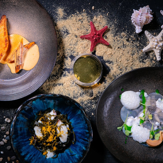 Островной сет от Антона Магдюка: карпаччо из гребешка с пеной из морской воды и свежей зеленью, салат из ферментированной морской капусты и осьминога, копченый дуэт из моркови с лососем, приготовленный на открытом огне, под сливочным соусом.