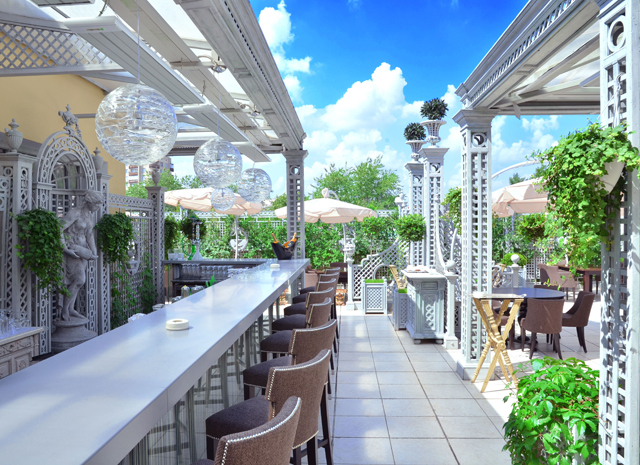 В номинации "самая белоснежная" в этом году, по нашему мнению, победила веранда ресторана "Счастье на крыше" на Пушкинской. Перестроенная к новому сезону, она теперь располагает дополнительным пространством и готова к наплыву гостей. Ангелочки, вензеля и прочие "милости" остались неотъемлемым атрибутом этого заведения, так что, господа брутальные гурманы, проходим дальше.