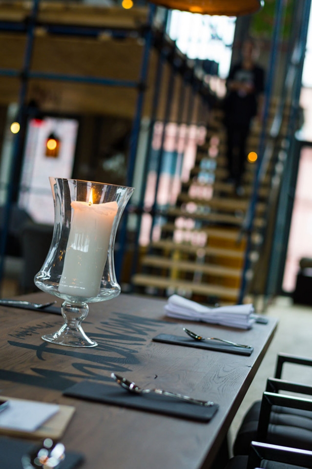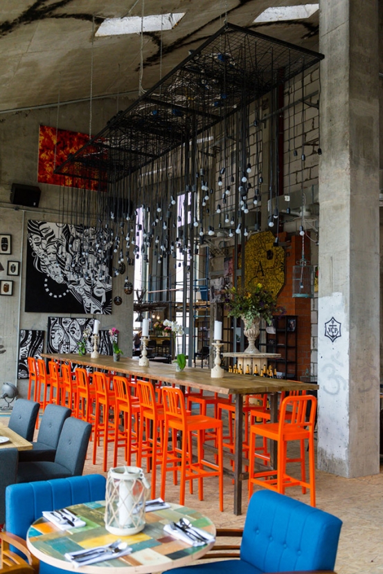Атмосферу места во многом диктует его необычный дизайн, над которым поработала прекрасная команда во главе с основателем бюро P H.D. и супругой идейного вдохновителя проекта Ланой Гриневой. Огромное пространство лофта под крышей выгодно зонировано, стены раскрашены известными московскими и иностранными художниками (свою лепту внес и один из самых известных графитчиков в Москве Женя Оззик), все внимание акцентировано на гигантской открытой кухне, на которой, словно пчелки, трудятся улыбчивые повара. В общем — эстетическое удовольствие гарантировано.