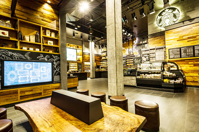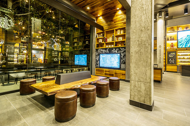 Тематический Starbucks имеет большой внутренний двор, пространство которого полностью организовано вокруг старого дерева (разумеется, живого). Вся мебель в эко-заведении изготовлена из переработанных древесных отходов, включая барные стойки и напольное покрытие. В основном зале кофейни установлена трехметровая видео-инсталляция, изготовленная специально для нового калифорнийского заведения и демонстрирующая образовательные ролики.