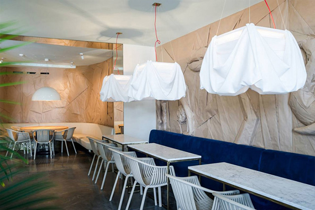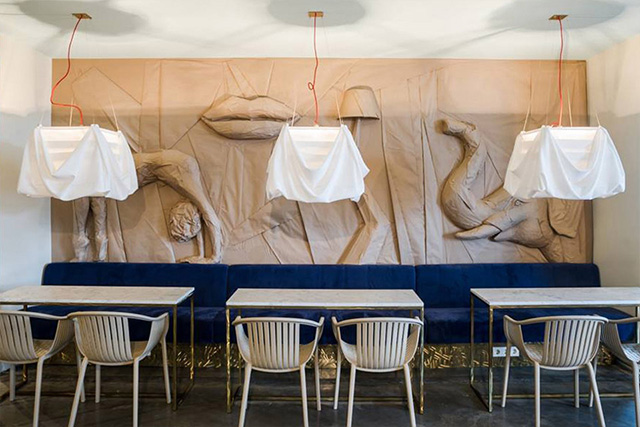 Авторами амбициозного проекта стали дизайнеры из студии Annvil во главе с Анной Бутеле. В интерьеры нового кафе латыши поместили основные мотивы творчества эпатажного сюрреалиста: глаза, губы, изящные волнистые линии и ткани с драпировкой — в общем, все то, что без упоминания о Дали, сложно представить себе в рядовом ресторанчике. Цветовая палитра внутренней отделки вращается вокруг любимых цветов Дали — синего и золотого (особенно эффектно выглядят диваны глубокого морского оттенка). Вообще, лучше увидеть это своими глазами, так что записывайте адрес (запомнить этот набор символов нельзя): Maskavas iela 12 k-1.
