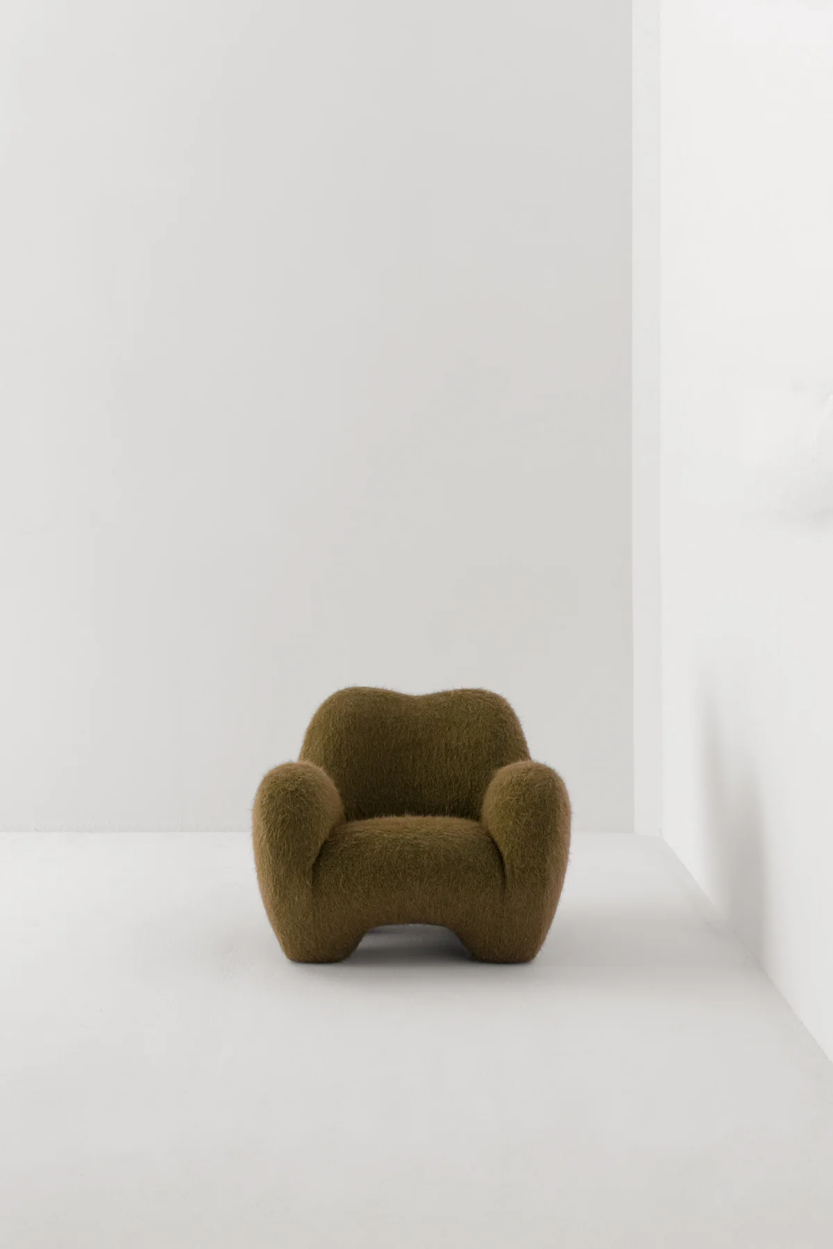 Кресло Gummy особенным делает объемная форма, которая, как можно догадаться из названия, напоминает медведя. Выполнен этот предмет мебели из натуральных материалов, таких как фанера, пружины, мешковина и шерсть. К слову, все изделия студии изготавливают вручную с помощью традиционных ремесленных техник.