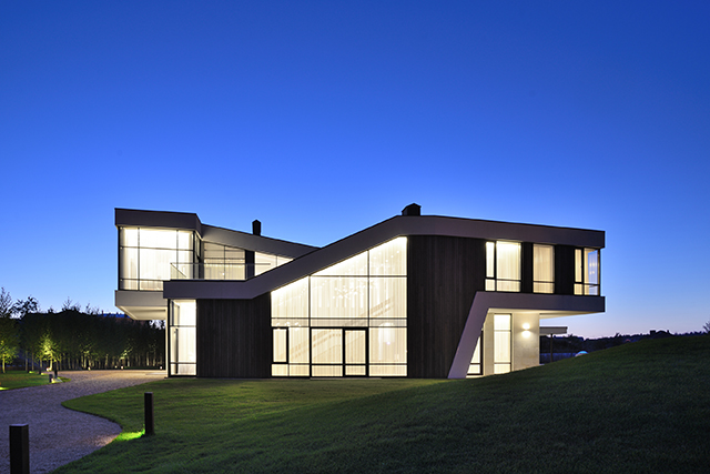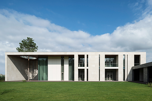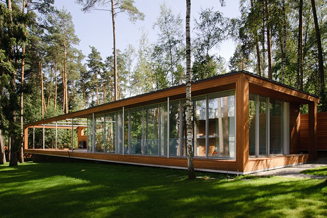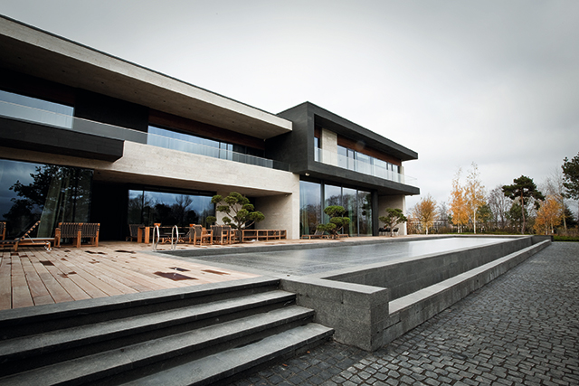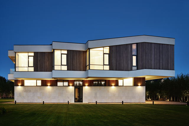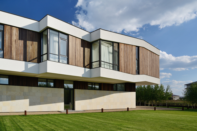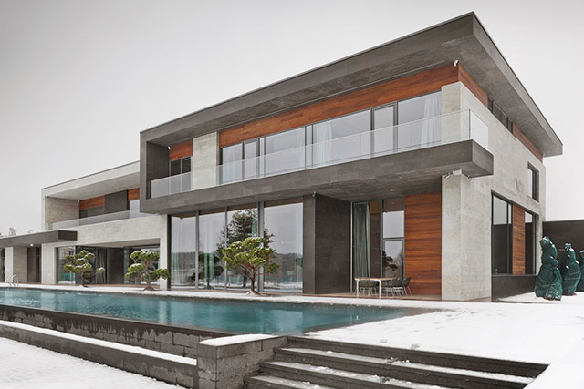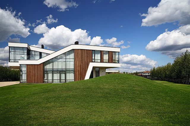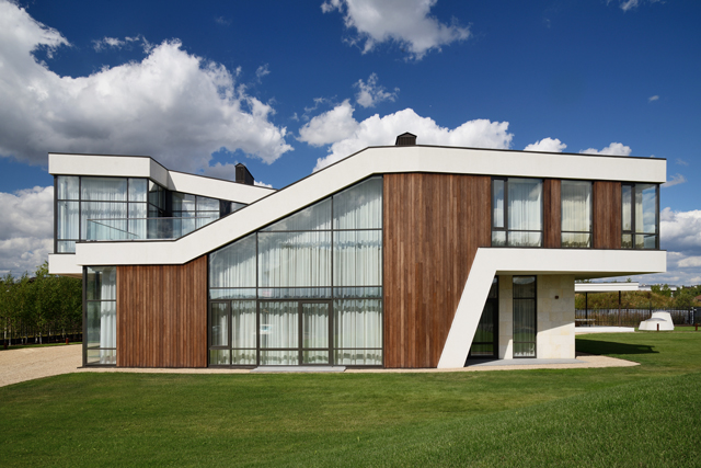Модернистский дом, возведенный архитекторами бюро «Архи Те Кто», расположен в элитном поселке на берегу Москвы-реки. Двухэтажный объем включает все необходимое для жизни семьи из 4—6 человек в доме премиум-класса. В отделке преобладают натуральные материалы: камень и дерево. Интерьеры выполнены Реми Тессье и Ланой Гриневой (студия «Философия дизайна»).
