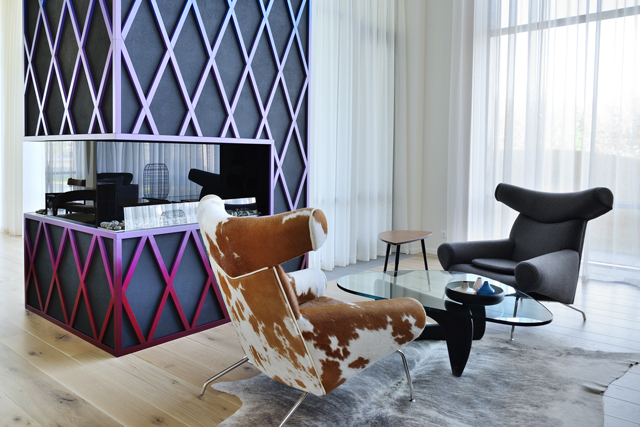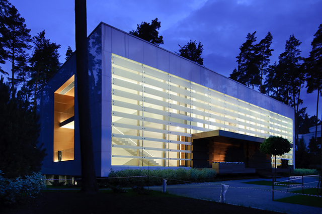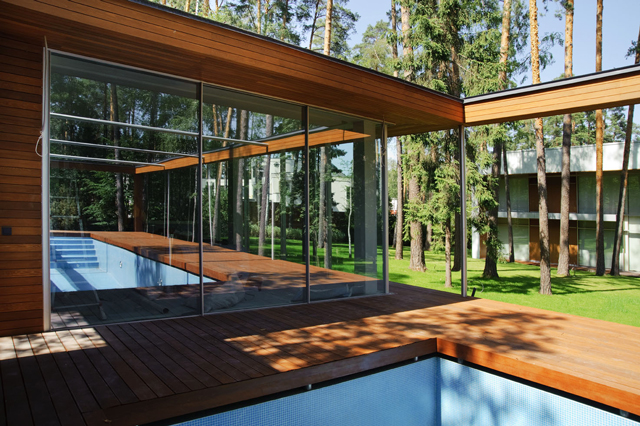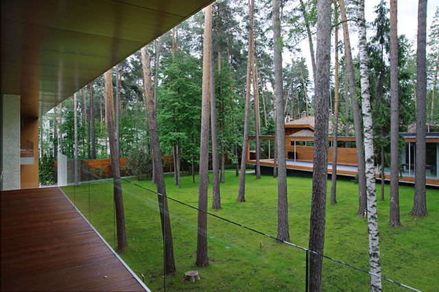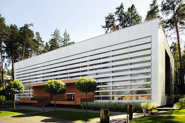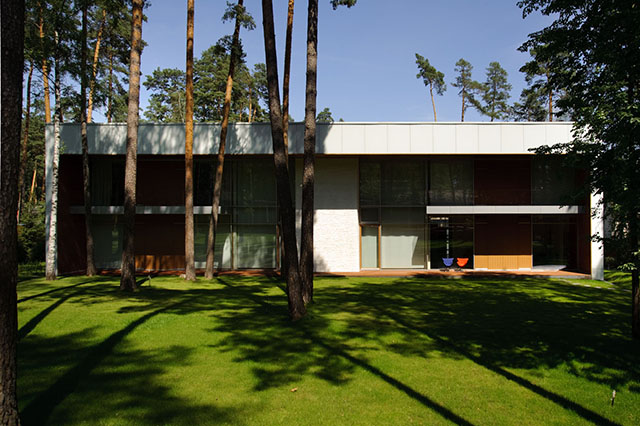 Вилла на Рублевском шоссе обращает на себя внимание оригинальной планировкой. Три объема одинаковой длины поставлены параллельно друг другу и отличаются отделкой: один покрыт черным сланцем, другой — красным канадским кедром, третий, главный корпус — белый, облицован эмалитом. Дом стоит в красивом сосновом лесу, поэтому архитектор предусмотрел фасады с раздвижным остеклением. Чтобы вдыхать воздух и наслаждаться пейзажем.