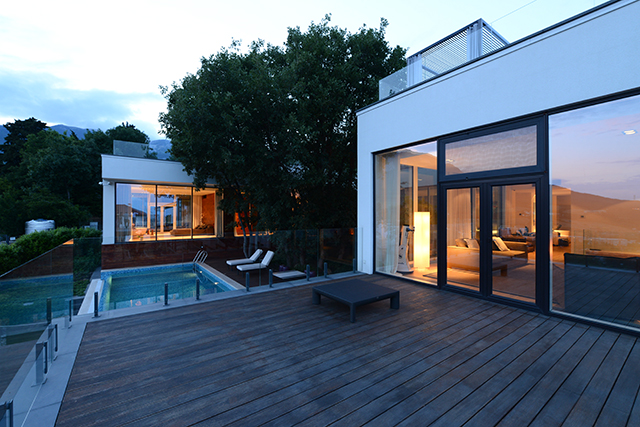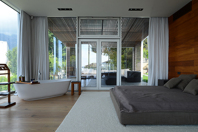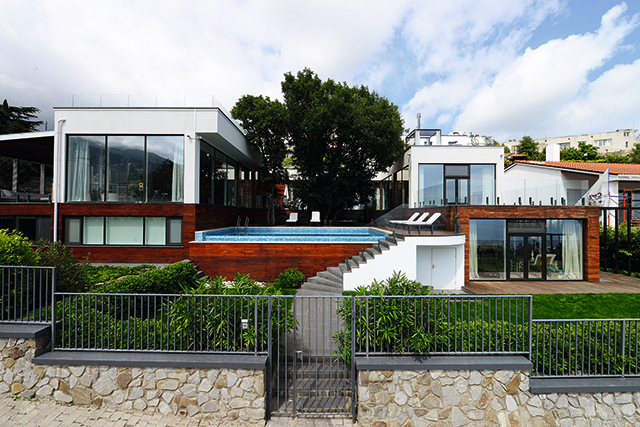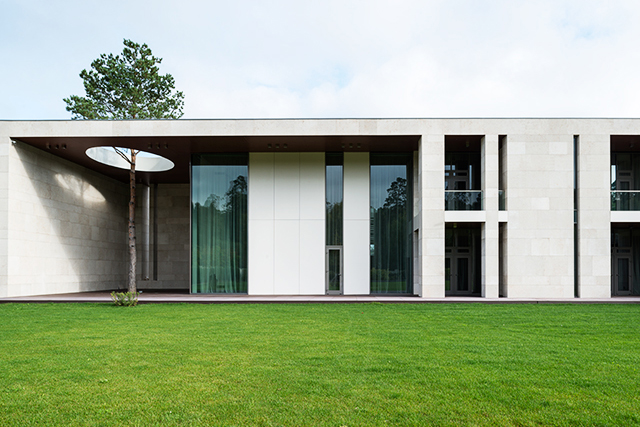Дом в поселке Жуковка XXI — удача архитектора Юлия Борисова. Площадь — около 1000 м2. Стройные стены и аккуратный фасад одеты в природный камень. Обилие натурального камня и дерева cмягчает строгую геометрию. Фасадная стена переходит в интерьерную. Панорамные стекла специально созданы по заказу бюро в Швейцарии, и их высота — 7,6 метра. Благодаря уникальному размеру окон создается ощущение присутствия вне дома.