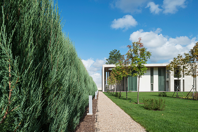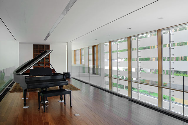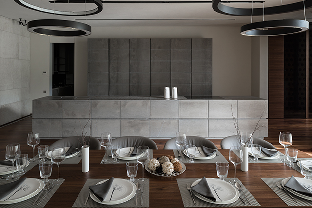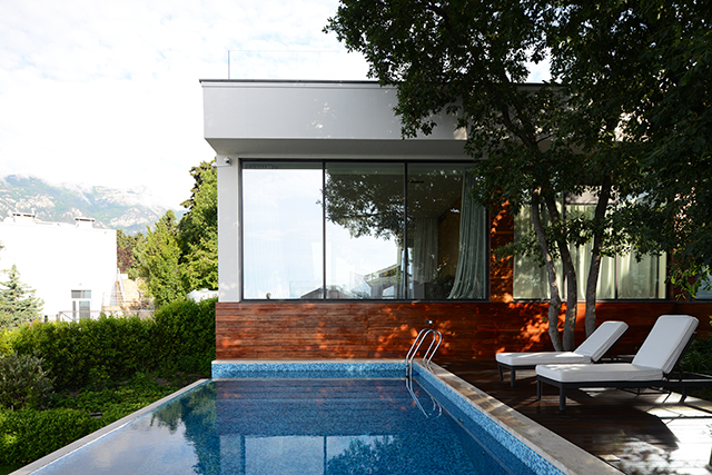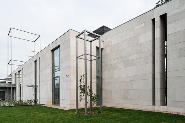 Уклон рельефа и желание сохранить старинный дуб определили сложную архитектуру здания. «Это не дом-кубик, ясный и понятный, с каждой стороны он выглядит по-новому», — говорит архитектор проекта Алексей Николашин. Постройка располагается террасами. Все уровни связаны между собой как снаружи, так и внутри. На самом верху — гараж. Спускаясь, попадаешь на кровлю, засыпанную белой мраморной галькой, — здесь устроена терраса для отдыха и занятий йогой.