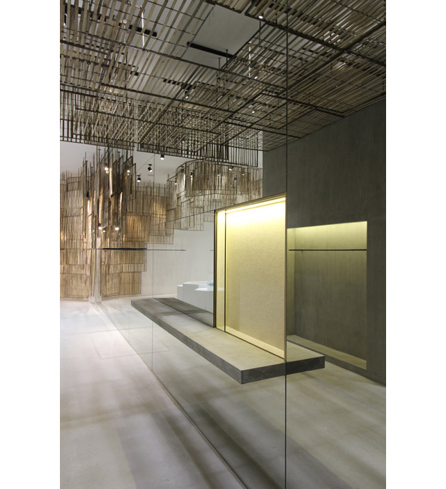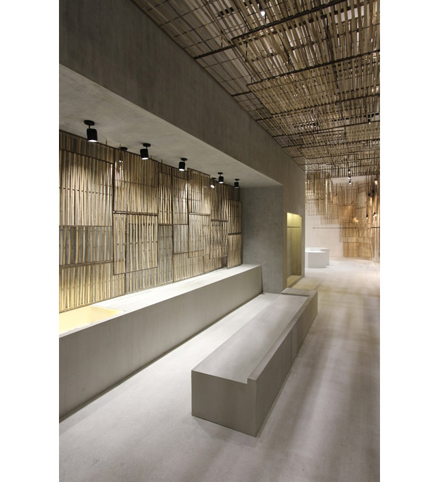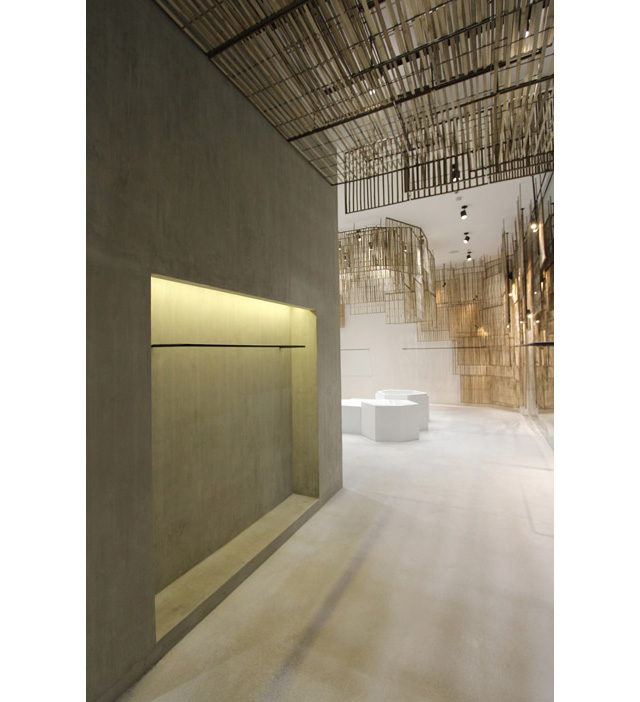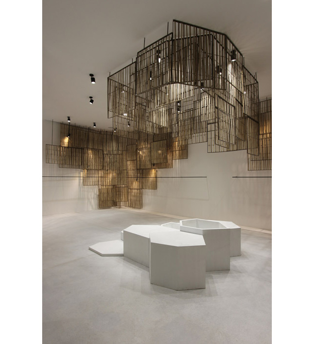 Французские креативщики заказали у местных мастеров 236 плетеных экранов из бамбука разной формы и размеров. Деревянной "кожей" дизайнеры покрыли стены внутри магазина, а также декорировали свободные пространства. Так, в одном из залов располагается огромная инсталляция в виде люстры из бамбука.