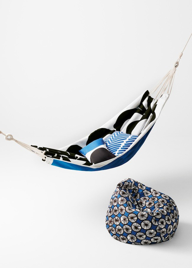 Посмотреть огромную коллекцию всего-всего можно будет живьем и онлайн, начиная с 17 апреля в магазинах Target. В числе предметов для отдыха от Marimekko есть гамаки, пляжные зонтики, доски для серфа, тарелки, пуфы, палатки, одежда, купальники и даже велосипед — все в фирменных орнаментах и цветах. Ох, чуть не забыли — есть еще воздушный змей с синими узорами — куда ж на отдыхе без него.