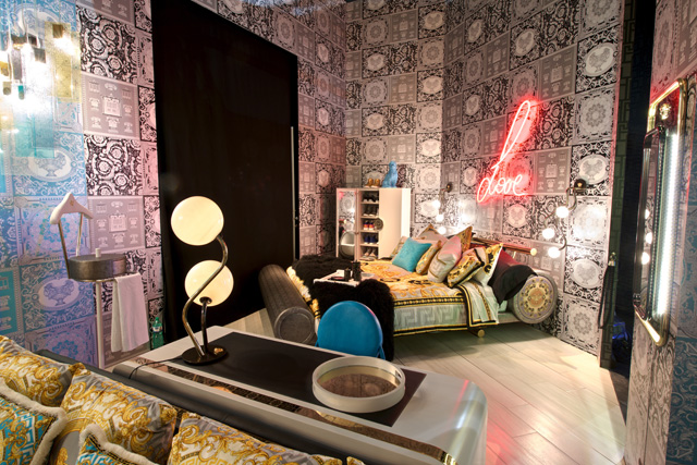 Другая новинка Versace Home этого года — линия La Coupe des Dieux: микс барокко, ар-нуво и модерна. Знаковый предмет коллекции — одноименный стул, о котором мы уже писали в анонсе iSaloni. Однако раньше, чем вышеупомянутый стул, обращает на себя внимание спальный гарнитур La Coupe des Dieux — настоящая спальня для денди, выполненная в золотом, черном и насыщенном бирюзовом цветах. Здесь обилие греческих принтов, золота, барочных орнаментов, фирменных медуз, вышитых кристаллами на меховых покрывалах, и таких деталей, как, например, кофейный столик, отделанный по периметру мехом ламы, — Versace в ударе! Особое место в дендистской почивальне занимает домашний халат (любимая модель Джанни Версаче), выполненный из шелка (а подкладка — из хлопка).