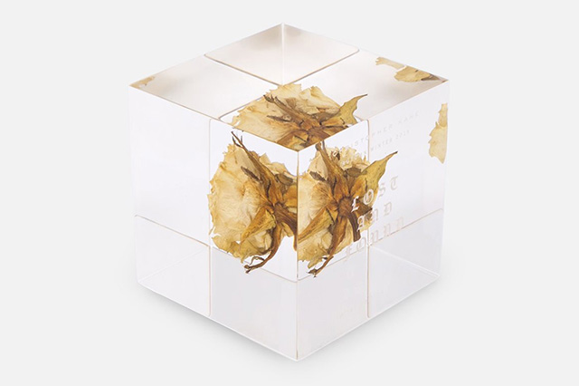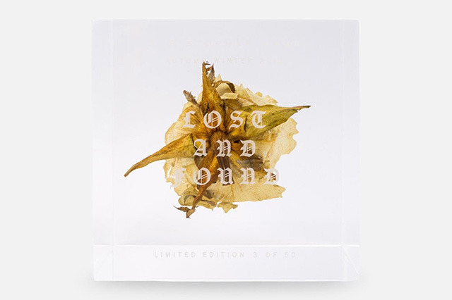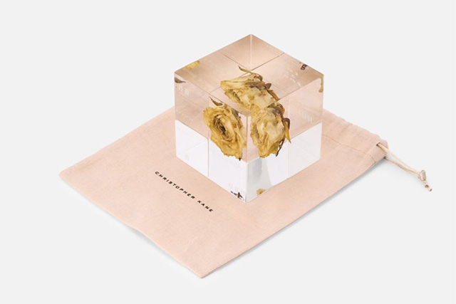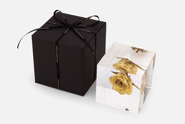 На днях дизайнер представил пресс-папье в виде стеклянного куба 8х8 сантиметров, внутри которого заключена роза. Такой декоративный элемент оформления стола обойдется в $ 125 и, по словам автора, «придаст строгому кабинету романтическое звучание». Всего изготовлено 50 таких пресс-папье. На каждом из них выгравирован порядковый номер и название Lost and Found — отсылка к осенне-зимней коллекции Christopher Kane.