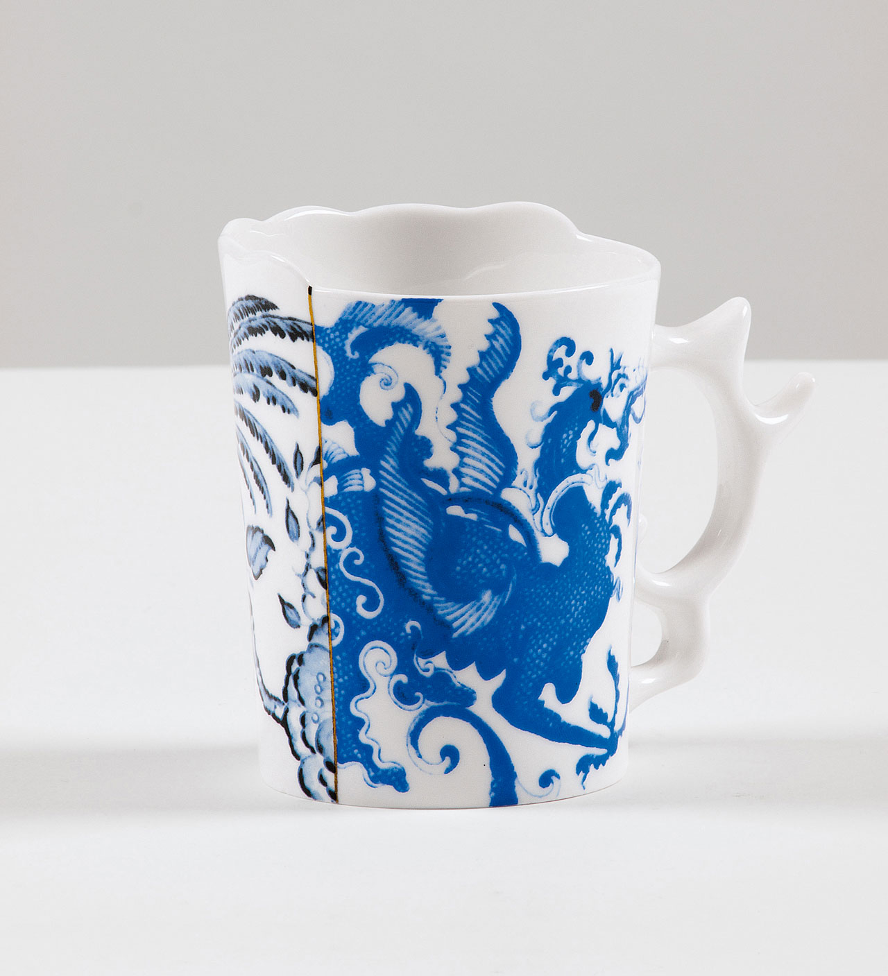 Три чаши, три обеденные тарелки, три блюдца, три кружки для чая, три — для кофе и салатница сделаны дизайн-бюро CtrlZak для марки Seletti из фарфора и украшены на особый манер.