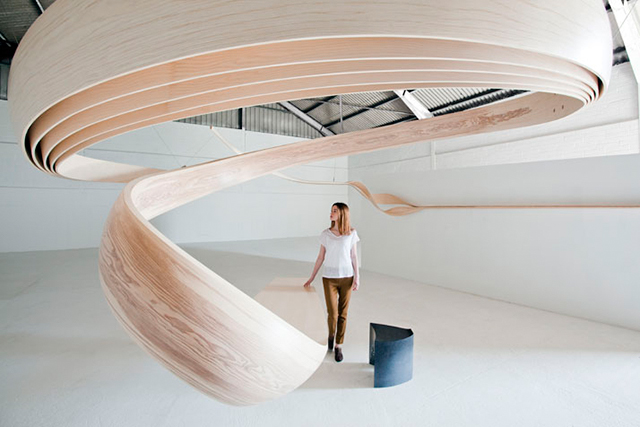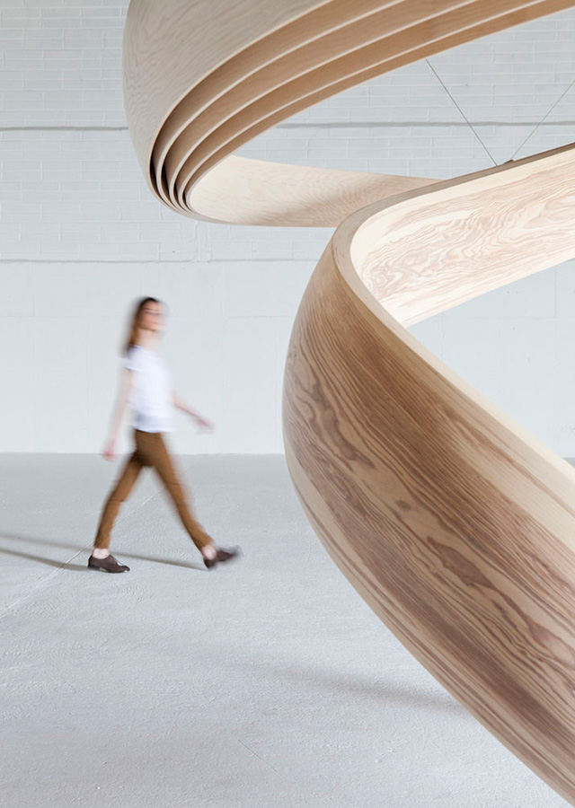 Инсталляция выполнена из деревянных опилок, закручена по спирали от пола до потолка и занимает все пространство комнаты, в которой находится. Части скульптурной работы можно адаптировать под человеческие нужды: например, основание легко может выступать в роли скамейки, а части, проходящие по стене, выполнять роль книжных полок.
