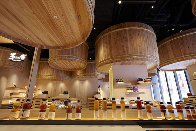 Сотни бутылочек пикантного соуса, японский колорит и дух фабрики, занимающейся производством древнего соевого продукта уже более 120 лет, — совместить все это в одном помещении (пусть даже и весьма вместительном — 133 кв. метра) предстояло архитекторам бюро Kengo Kuma and Associates. В интерьерах нового токийского магазина соевого соуса Kayanoya дизайнеры решили обратиться к истокам производства спорного (дело в том, что за статус родины этой жидкой пряности уже много лет сражаются Китай и Япония — прим. ред.) продукта и декорировали его огромными кедровыми бочками, подвешенными к потолку.
