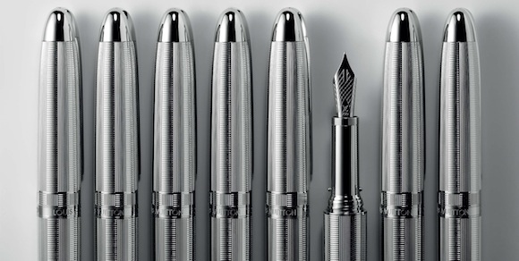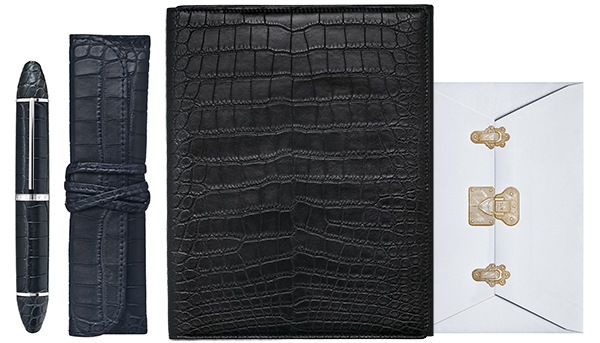 12 различных по цветовой гамме чернил заполнили гравированные баночки с яркими этикетками, уникальные перьевые и автоматические ручки "оделись" в кожу аллигатора, которая также доступна в 13 цветовых вариациях, в то время как тетради запомнились нам бумагой с неизменными логотипами дома и шестью видами обложек.