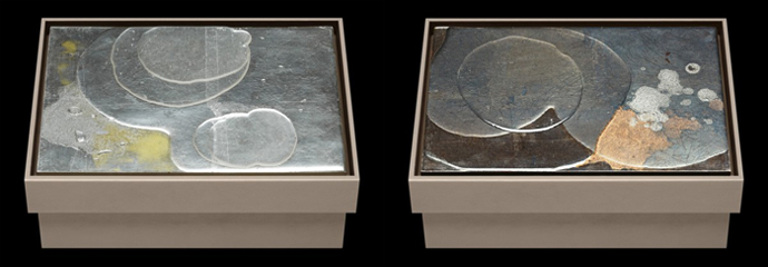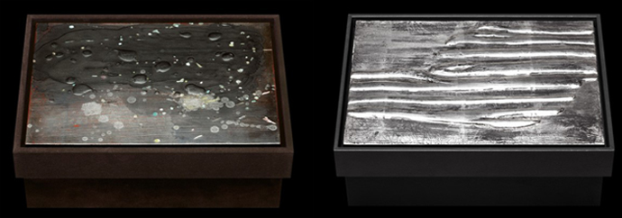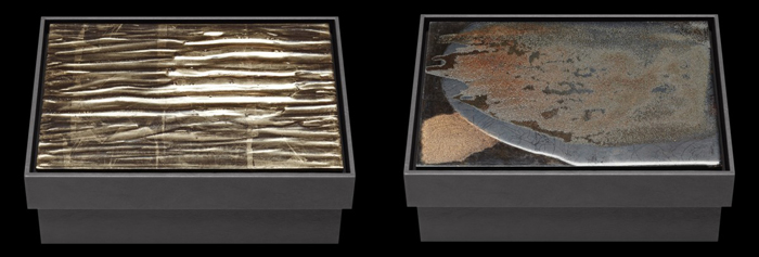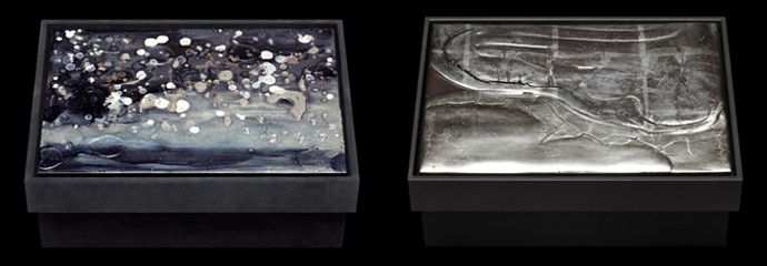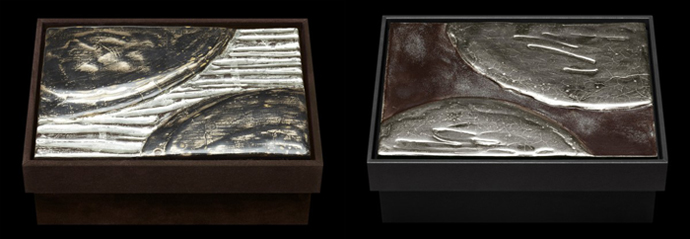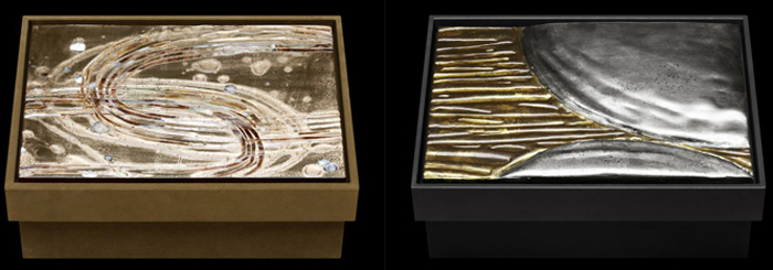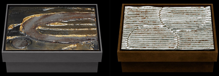 Некоторые из крышек боксов украшает сложная работа из многослойного перламутра: слой за слоем нанесенная краска образовывает трещины и сложноразличимые знаки на твердой блестящей поверхности. Материалы, используемые в данной коллекции включают серебро, белое золото, черное серебро, палладий и сусальное золото.