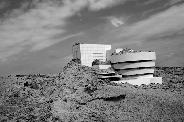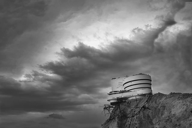Наполненный философскими размышлениями о крахе современного арт-института, "Апокалипсис в искусстве" изображает ведущие мировые музеи искусства в условиях природных катаклизмов. Например, нью-йоркский Музей Соломона Гуггенхайма на одном снимке балансирует на вершине утеса, на другом — наполовину погребен под грудами пыли. Творение Оскара Нимейера в бразильском городе Нитерое поражает молния разверзнутых небес, а парижский Центр Помпиду еле держится на горе, в то время как песчаная буря разрушает его стены.