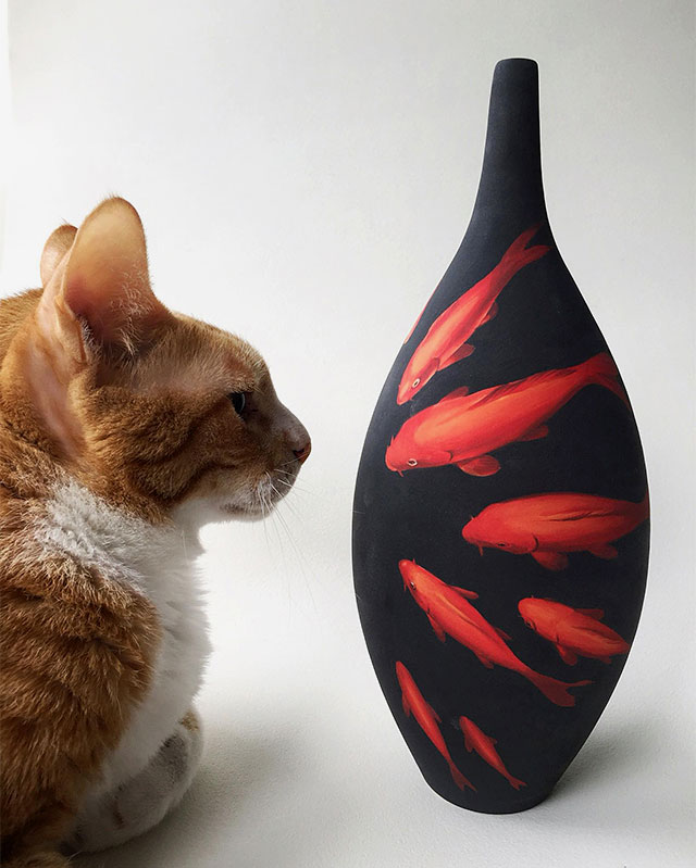 На вазах не только небо, но небо — самое захватывающее. Художнице и керамисту Нихарике Хукку терпения, кажется, не занимать: мельчайшие детали природы, которую она старательно выписывает тончайшей кистью, говорят о том, что девушке и картинки к учебнику ботаники дались бы легко. Но нас в этих вазах привлекает не детальность изображений, а жизнеутверждающие яркие краски (вот где Индия выразилась) и умение вовремя остановиться: вазы покрыты изображением не полностью, и это делает их еще более выразительными. Мы в восторге — и от ваз, и от Instagram-аккаунта, им посвященного.