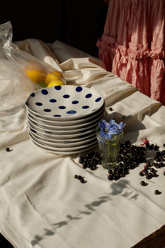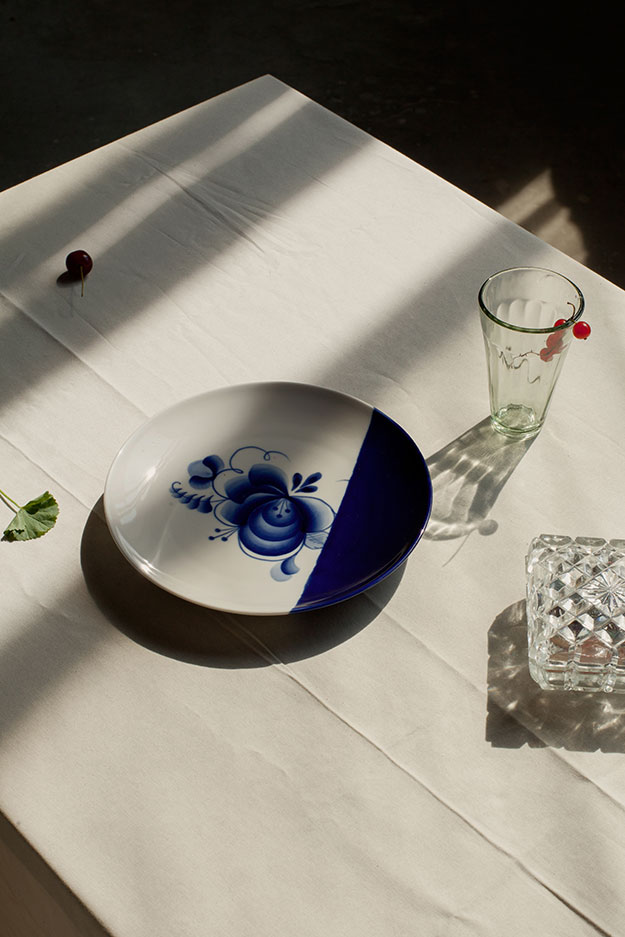 В коллекцию вошло два варианта тарелок, целиком выполненных и расписанных вручную. Делали их по классическим ремесленным традициям на фабрике «Объединение Гжель». За дизайн отвечала графический дизайнер Анна Кулачек. Воплотить идеи в жизнь ей помог онлайн-магазин посуды Half & Half (обновленный Moloko.co). Коллекция выпущена ограниченным тиражом. Стоимость тарелок — 4 650 рублей за ту, что с цветком, и 3 650 рублей за ту, что в горошек.