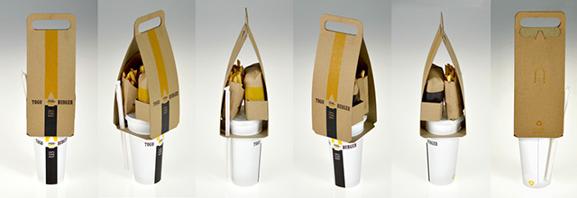 Togo Burger — удобнейшее приспособление, позволяющее оптимизировать трудозатраты при покупке еды "на вынос". Теперь весь обед можно держать двумя пальцами. Картонный держатель для фастфуда имеет удобный круглый вырез для стакана с напитком, одна стенка "оборудована" отсеком для бутерброда, другая — небольшим крючком для картофеля.