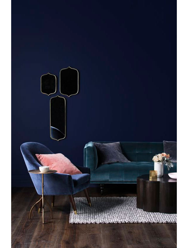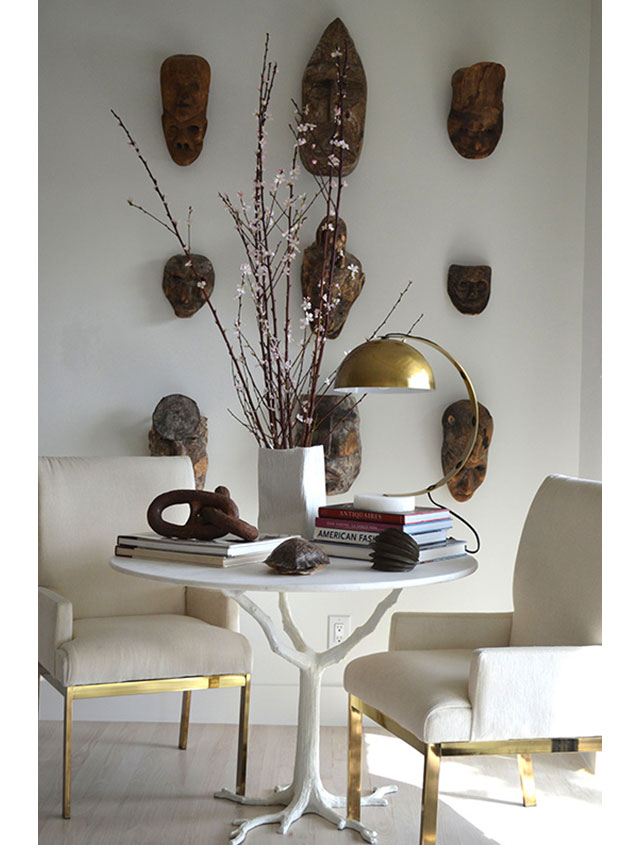 Я уже упомянул несколько признаков new retro, среди которых на самой вершине стоят мрамор (часто матовый), латунь и бархат. Но есть здесь место и другим приемам: тут и классическая разбивка стен в современном интерьере, и деревянные панели на стенах, деревянные столешницы с грубыми необработанными краями, часто отсутствие штор на окнах, каминные порталы, имитации винтажных люстр итальянского дизайна 60—70-х годов, крупногабаритный арт на стенах (желательно из латуни или меди), «пыльные» пастельные оттенки в отделке и текстиле (впрочем, часто в сочетании с яркими и глубокими тонами: рыжим, горчичным, темно-синим и глубоким изумрудным, — обои (часто с преувеличенно крупным рисунком), металлизация с оттенками бронзы и золота, включая розовое золото, винтажные лампы накаливания, предметы с блошиных рынков, использование толстой кожи в отделке, крупных многогранников в напольной плитке, предметы custom made, нарочитое отсутствие брендированных предметов, меха, серебряных оттенков в предметах (включая сантехнику).