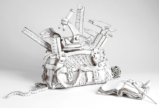 Лондонская художница Катарина Морлинг называет свои работы "трехмерными рисунками". И действительно — статуэтки из керамики выглядят, как ожившие карандашные наброски, объем которым придает воздушная текстура хрупкого материала. Сюрреалистичные деревянные стулья, "прорисованная" кожа, рюкзаки с огромным количеством деталей, молнии, печатные машинки и даже спички приобретают причудливые формы и "замирают" в картинах, которые можно потрогать руками, а легкий эффект оптической иллюзии делает их "одушевленными".