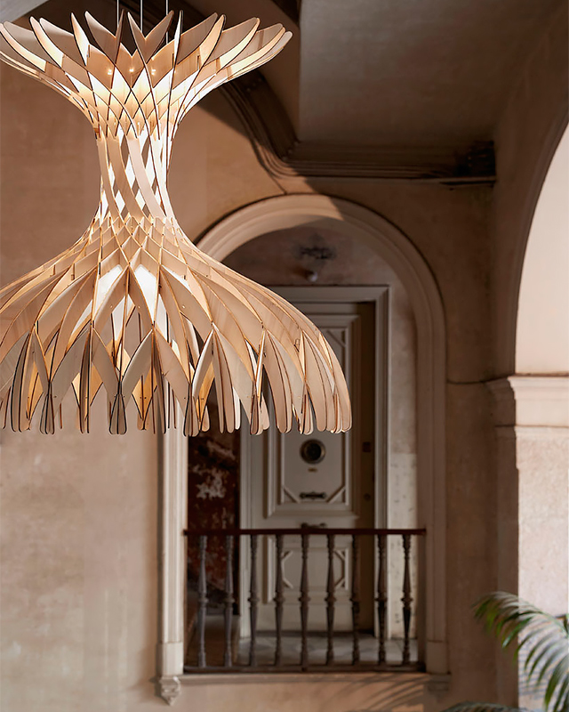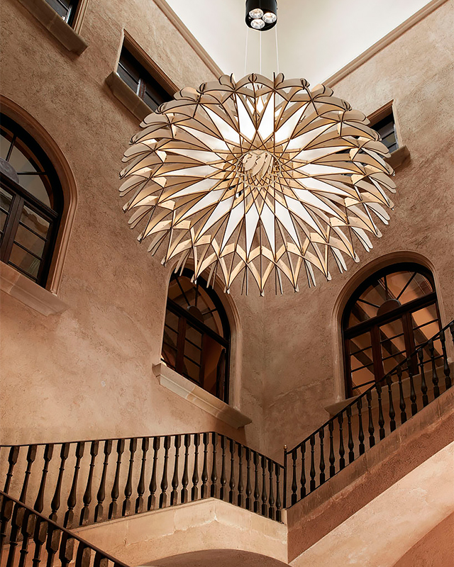 Можно, конечно, объяснить их дизайн-проект и неуемной страстью к инновациям, и много чем еще, но мы-то знаем, что все берет начало в детстве. Люстра, созданная из дерева, состоит из 170 отдельных деталей, крепления для сборки которых не использовались вовсе. Выполненная в духе ренессанса, она спроектирована таким образом, что каждый из элементов конструкции соединяется с другим, образовывая прочный замок. Не мудрствуя, создатели люстры назвали ее «Куполом» (Dome), что точно отражает форму предмета.
