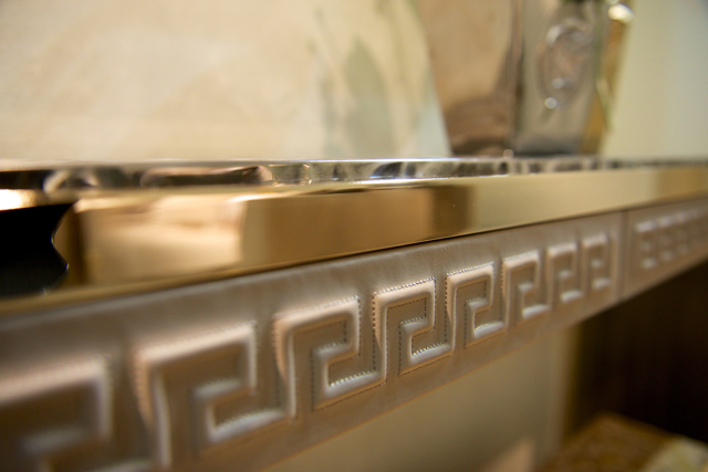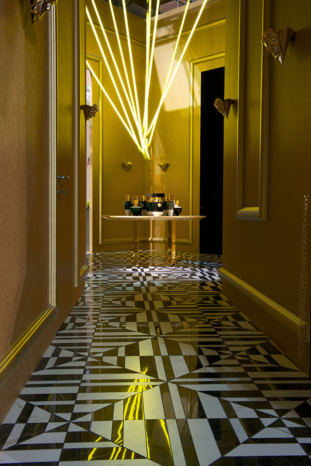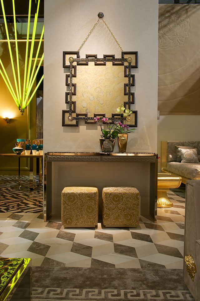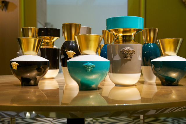 По словам Донателлы Версаче, в новой коллекции Versace Home глава модного дома хотела привнести в домашние интерьеры все самые дорогие ей элементы дизайна Палаццо Версаче в Милане. Так, голова медузы — символ марки, которым украшен парадный вход в главный офис Донателлы на Виа Джезу, — переносится на мебель и детали интерьера.