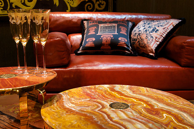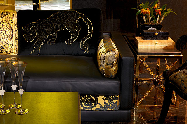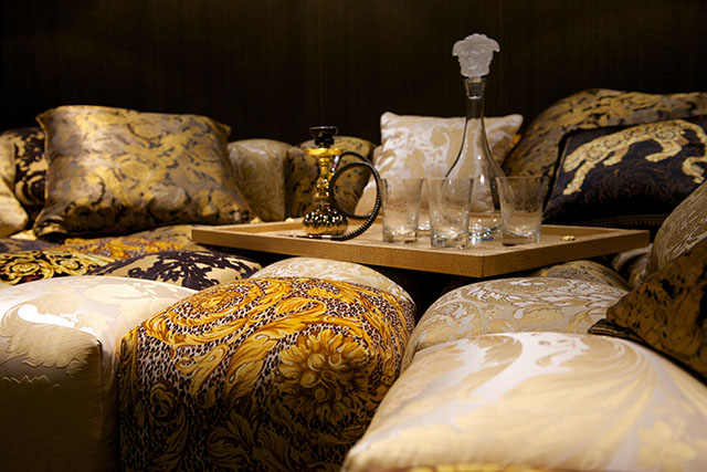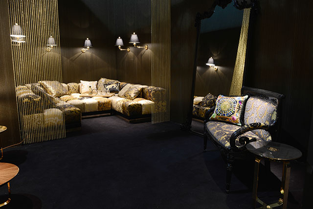 Золотые головы медуз украшают фронтальные части подлокотников дивана Palazzo Sofa — знаковой вещи из новой коллекции. Этот диван был задуман как "мебельный аналог" новой IT-bag от Versace, сумки Palazzo. Диван выполнен из нубука жемчужно-серого цвета и декорирован прошивкой из диагональных линий, соединяющихся в центре спинки в виде буквы "V".