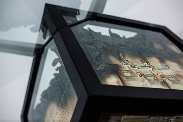 Современное искусство и дизайн сошлись лицом к лицу в новой работе студии Amarist и Алехандро Монге. Задавшись вопросом "Слишком много?", они создали стеклянный стол, в основании которого лежат пачки денежных купюр. Но это еще не все: тысячи бумажек номиналом 50 евро, плотно "укомплектованные" внутри стеклянного куба, полыхают синим пламенем. Пусть это не настоящие деньги, а всего лишь бумажки, раскрашенные вручную и склеенные между собой, однако эта деталь художественной ценности работы "Слишком много?" совсем не умаляет.