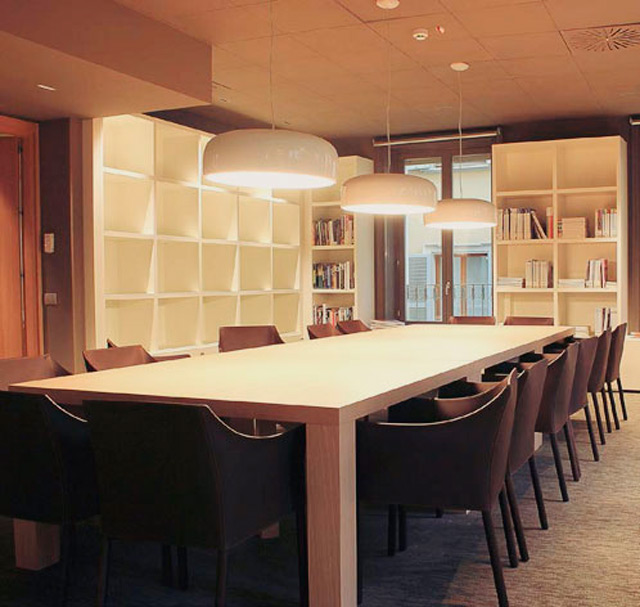 Пять этажей нового кампуса отреставрированы, а минималистичные интерьеры обрамлены стеклянными перегородками и стенами. Сдержанные интерьеры дополнены яркими акцентами и предметами из классических коллекций Каппеллини, а в некоторых аудиториях и холлах можно найти такие экземляры современного дизайна, как стулья из коллекции Марселя Вандерса Dalia, светящаяся красная полка для книг Revolving от Широ Курамата, стулья Джаспера Моррисона Low Pad или цветные стулья от Адама Гудрама из коллекции Stitch.