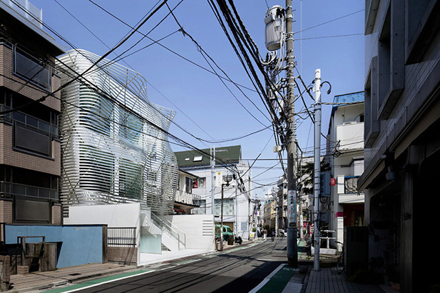 Японские архитекторы из конструкторского бюро Amano Design Office представили свой последний проект под названием Dear Jingumae — обновленный коммерческий офисный блок в Токио с волнообразным фасадом. Изогнутые трубы оригинального производителя SUS Piping из нержавеющей стали по форме напоминают оконные жалюзи, полностью обволакивая старинное трехэтажное сооружение. Первоначально проект ставил целью повторить мягкую фактуру ткани и оживить близлежащие индустриальные окрестности в сложный период экономической стагнации в стране.