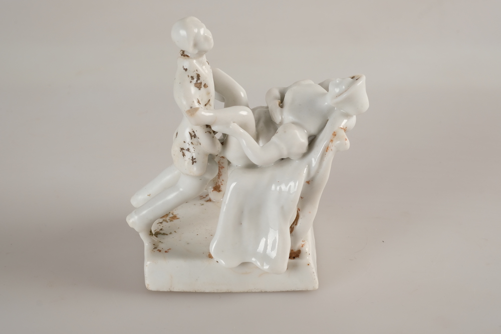 Одной из самых популярных статуэток была сценка с монахом-черноризцем, который тащит девушку в монастырь, спрятав в снопе пшеницы, — прямое заимствование из Германии, только там был монах-бенедиктинец. В России персонажей просто переодели и сделали русскими. Из коллекции Злова мне понравился сюжет с женщиной, которая ищет блох у себя на груди. Мы тоже можем заглянуть ей в декольте вместе с ней и увидеть, что там под рубахой. Распространена была французская игрушка девушка-перевертыш: дама лежит в постели, она прилично накрыта одеялом, но стоит ее перевернуть и посмотреть снизу, — там сюрприз. Подобные игровые эффекты постоянно сопровождали эту закрытую эротическую культуру. Интересный сюжет в серии Злова с петухом, который топчет курочку, — такого, чтобы сюжет переносил нас в мир животных, я раньше не видел. Статуэтка с трио — некая пастораль, декамероновский сюжет, когда молодец застал и удовлетворил обеих дам. Если же двое из героев мужчины, то женщине идет двойной бонус. Сюжеты в порнографии непреходящие: как было в XIX веке, так и сегодня.