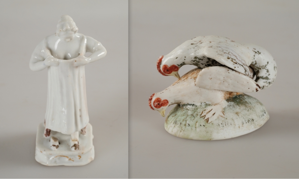 Статуэтки были обнаружены при строительстве жилого комплекса в Хамовниках. Это не результат работы плановой археологии, когда системно вскрываются пласты, а некая приятная сопутствующая строительству находка. В разных состояниях сохранности подобные фигурки постоянно всплывают на аукционах, и, надо признать, стоимость у них довольно высокая. Это связано не с их культурной значимостью, а со статусом. Подобные предметы обыденной жизни раньше в музеях не выставлялись, поэтому становились раритетами и объектами купли-продажи для коллекционеров. Главная ценность конкретно этого набора — в самой личности коллекционера, которая приносит нам совершенно литературный сюжет вместе с этими ординарными для своего времени, но уникальными сегодня наивными и грубоватыми вещицами.