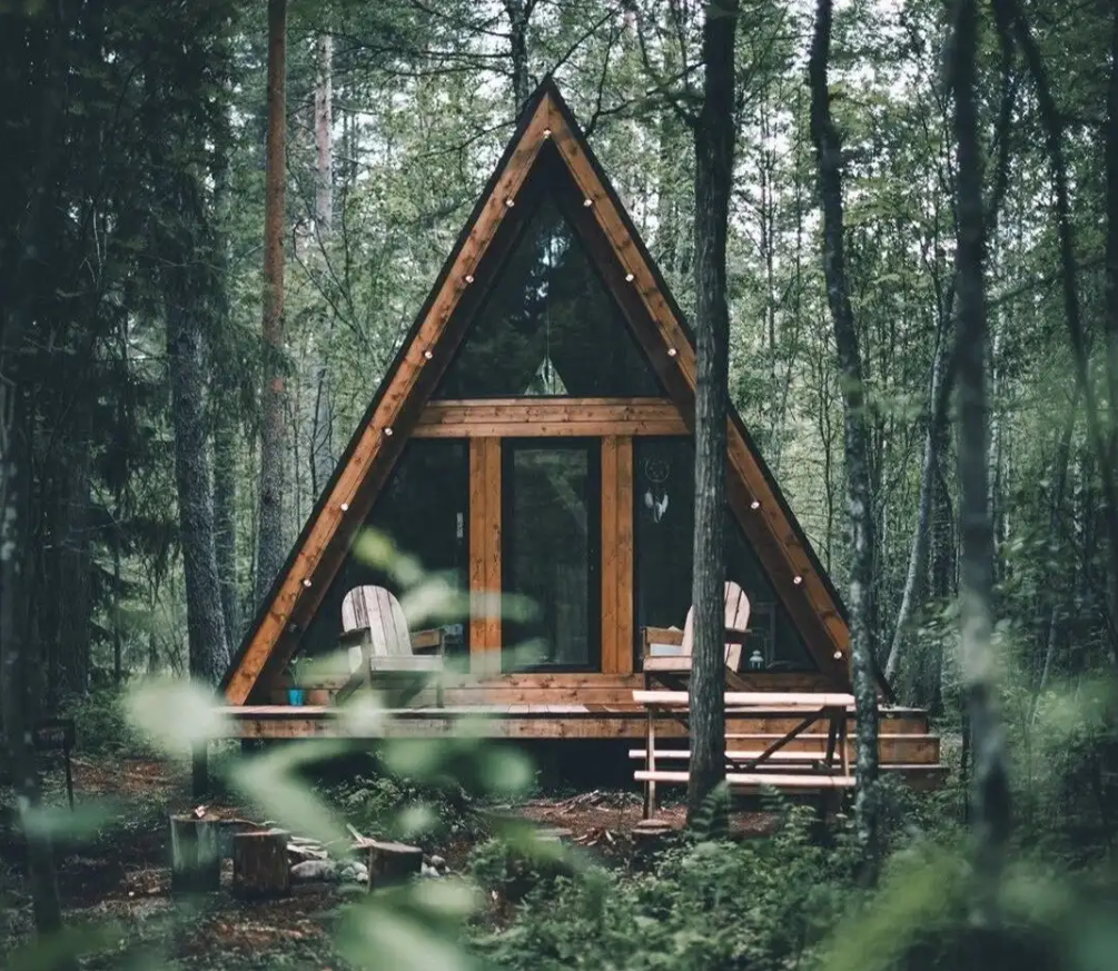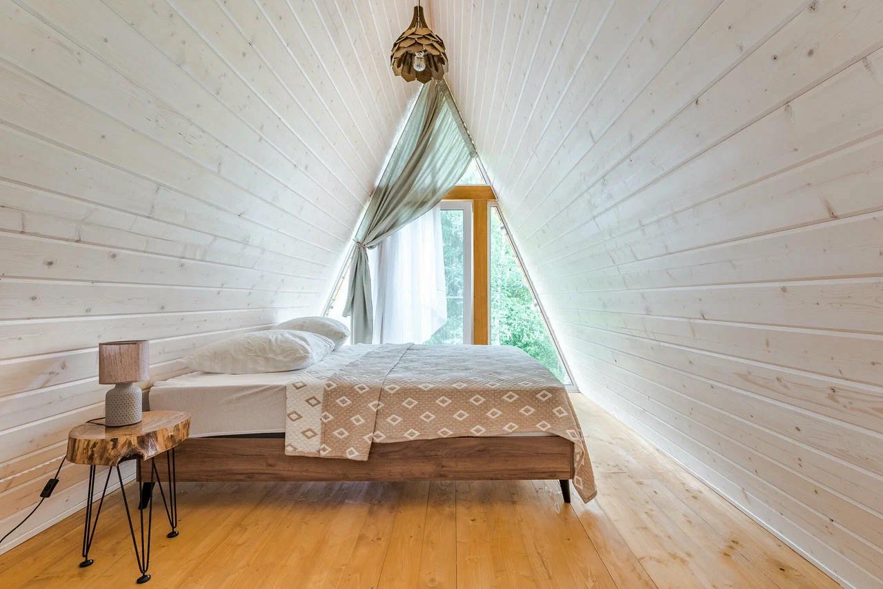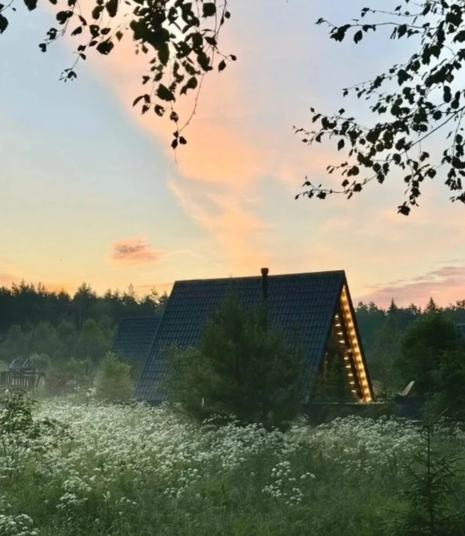 На двух гектарах раскинулись стильные A-frame домики трех форматов — от компактных для одного или пары до просторных для компании друзей. Все интерьеры в природной палитре, а каждый домик укомплектован базой: мягкие пледы, мини-кухня, душ, зоны для чтения и вечернего чая. В каждом есть горячий чан или баня. Вечером можно забраться в теплую воду, слушая, как трещат дрова, или развести костер рядом с беседкой, мягко подсвеченной гирляндами. Весной и лето здесь особенно приятно сидеть у реки Озерна, а прохладными вечерами — укутаться в плед и смотреть, как за деревьями садится солнце.