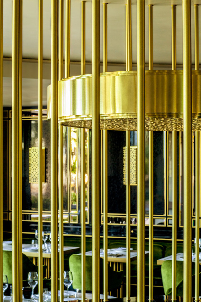 Новое заведение оформлено в стиле ар-деко — шик и роскошь азиатской культуры сочетаются в интерьере с элементами неоклассицизма. Первое, что обращает на себя внимание, — стол, окруженный медной дугообразной решеткой.
