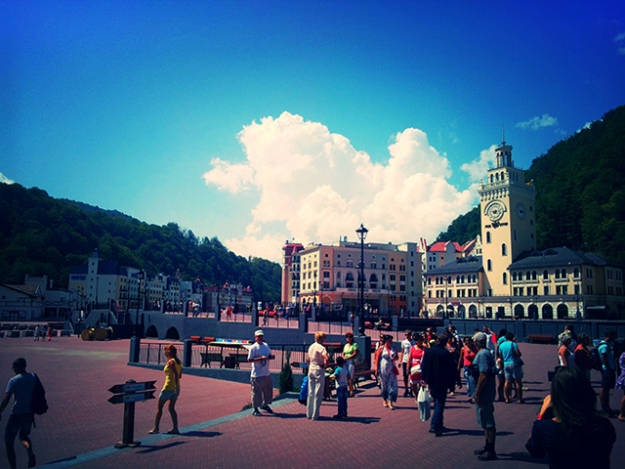Окрестности Красной Поляны меж тем пронизаны не только всевозможными автомобильными артериями. Перемещаться между олимпийскими объектами куда проще с помощью многочисленных канатных дорог. На фоне непрекращающейся стройки прямо сейчас это выглядит главным развлечением – пообедать на главной площади "Розы Хутор" и подняться наверх приезжают сотни отдыхающих в Сочи.