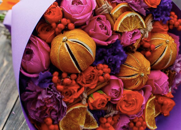 Если инжир во флористике используют свежий, то ряд других фруктов можно «подавать» в более долговечном, то есть сушеном виде. Например, дольки апельсина в сочетании с палочками корицы добавят букету не только новые краски, но и приятный аромат.