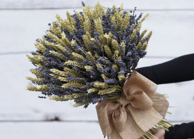 Начнем с самого традиционного из нетрадиционных решений. Лаванда — идеальное растение в оформлении по-летнему легких, неперегруженных букетов. Обычно ветки лаванды используют как дополнительный элемент, например, в композициях из пионов и кустовых роз. Но лаванда хороша и сама по себе, особенно в декоративных букетах для украшения интерьеров. Причем не только свежесрезанная. Букет из сухой лаванды и колосьев при правильном уходе будет украшать вашу гостиную несколько лет.