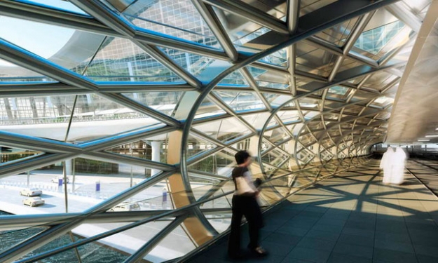 Грандиозное здание работы Kohn Pedersen Fox будет видно за полтора километра. Главный терминал достигает 50 м в высоту. Под куполом с алюминиевыми арками, которые придают конструкции легковесность, разместились общественные зоны, почти 30 тысяч кв.м. торговых площадей, зеленый сад площадью почти 8,5 тысяч кв. м. и даже арт-галерея.