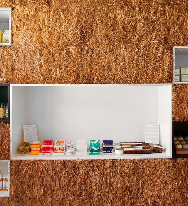 Конструкция польского косметического бутика не только экологически безупречна, но и финансово выгодна. Каждый из соломенных блоков размером 80х40х40 см обошелся строителям примерно в 4 доллара, а понадобилось их не больше ста штук. Соломенные блоки формируют две смежных стены с углублениями, в которых расположились натуральные косметические товары.