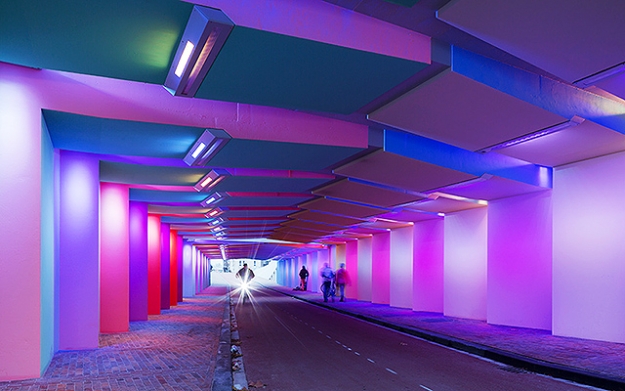 Тот случай, когда выражение «свет в конце туннеля» работает едва ли: в истории с нидерландским городком свет есть и в конце, и в середине, и в начале туннеля — на всем его протяжении. И это не лишь бы какая подсветка: бетонные блоки конструкции радуют глаз переливами голубого в оливковый, сиреневого в коралловый, фиолетового в ярко-розовый и не только — можно спутать с яркими световыми картинами Джеймса Таррелла.