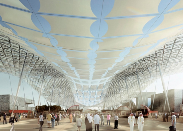 Ближневосточный город впервые станет хозяином мероприятия за всю 150-летнюю историю международной выставки благодаря проекту бюро HOK. Архитекторы разработали необычный павильон, по форме напоминающий космический корабль, центральная часть которого похожа на восточный базар.