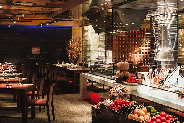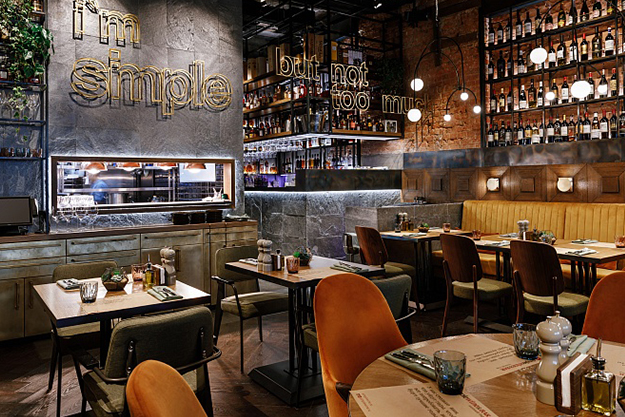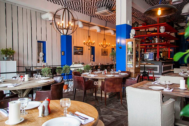 Шеф Максим Тарусин, составляя меню, очевидно, пытался угодить каждой из бывших советских республик — здесь и легкий салат из молдавской брынзы с бакинскими помидорами, и азербайджанский плов с бараниной, и хинкали с осетриной.