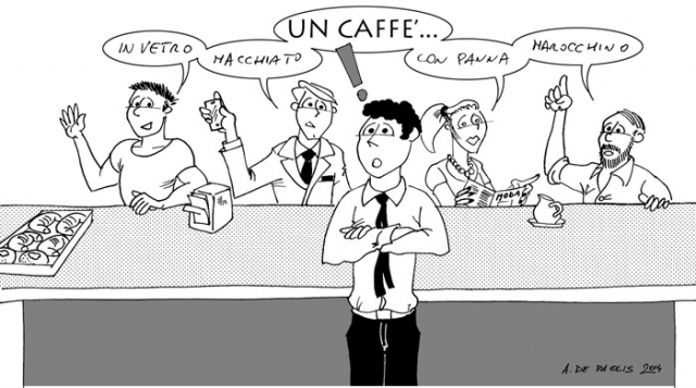 В барах итальянцы не рассиживаются. Даже наоборот: весь процесс обычно происходит у стойки, на ногах, по-быстрому и несколько раз на протяжении дня, причем чем южнее, тем сильнее проявляется данная привычка. И это всегда удивляет иностранцев. Многие из них привыкли посидеть за столиком, не торопясь, растягивая кофейную паузу на полчаса. А тут вдруг оказывается, что не во всех барах и столики-то есть. А в некоторых цена за столиком и у стойки значительно различается. Подобная практика особенно распространена в крупных туристических городах.