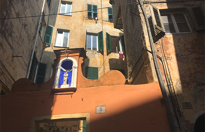 Существует стереотип о прижимистости генуэзцев. Будучи не одну сотню лет успешными купцами и банкирами, они не привыкли впустую тратить богатство. Вместо того чтобы вкладываться в лепнину на фасадах, они делали выбор в пользу более дешевых фресок. И эти расписные детали под козырьками крыш отлично сохранились — глядите вверх, прогуливаясь по Гарибальди, и надолго задержитесь около пудрово-голубого палаццо Ломеллини. Со стороны улицы можно стоять и мешать прохожим, рассматривая декор, но еще лучше пройти во двор, чтобы там вглядеться во фрески на арках и окунуться в буйную растительность.